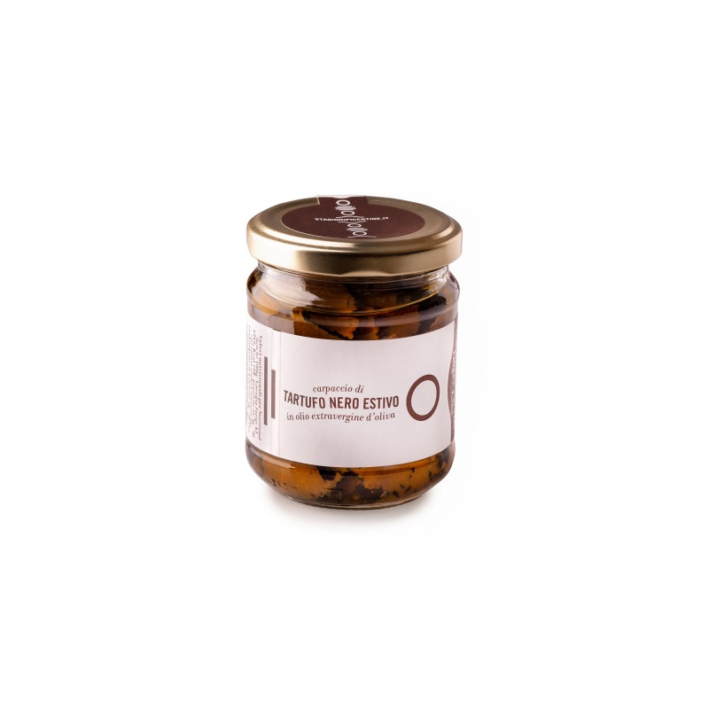Il Carpaccio di Tartufo Nero Estivo consiste in fettine di Tartufo conservate in olio extravergine d'oliva delle nostre terre, senza conservanti. Le fette sono selezionate da tartufi perfettamente integri,
